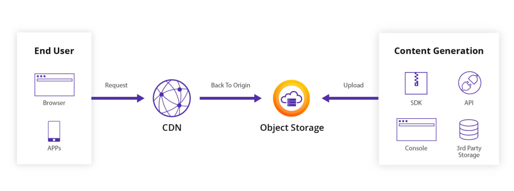 Object Storage cung cấp vùng phủ phân phối rộng, mang lại dịch vụ lưu trữ ổn định cùng khả năng xử lý tệp đồng thời với độ trễ thấp và thông lượng cao. Bạn có thể lưu trữ hình ảnh, âm thanh, video và các nội dung khác trên Object Storage, sau đó phân phối chúng qua mạng CDN tốc độ cao và đáng tin cậy của CDNetworks — giúp giảm tải các tác vụ tiêu tốn tài nguyên khỏi máy chủ nguồn của bạn.